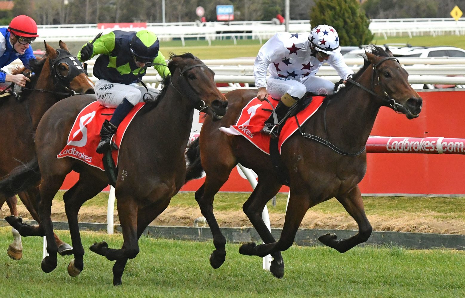Sunlight, above in white colours with stars, scored a gutsy win in the Quezette Stakes at Caulfield. Photo by Ultimate Racing Photos.