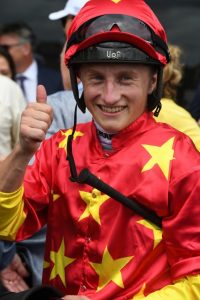 Winning jockey Tom Marquand celebrates Wednesday’s win aboard Prime Star. Photo Credit: Steve Hart.