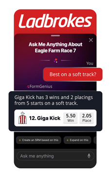 Form Genius is a powerful form analysis tool that makes doing the form easy by getting through mountains of data at the touch of a button! Ask it anything and get fast, form-based answers on any runner, jockey or trainer in any race. Use the smart prompts for deep insights and to sharpen your punting even further.